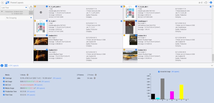 Detailed reports on substrates, ink, and production time per job improve transparency around cost and profitability, helping identify margin leakage and value creation.