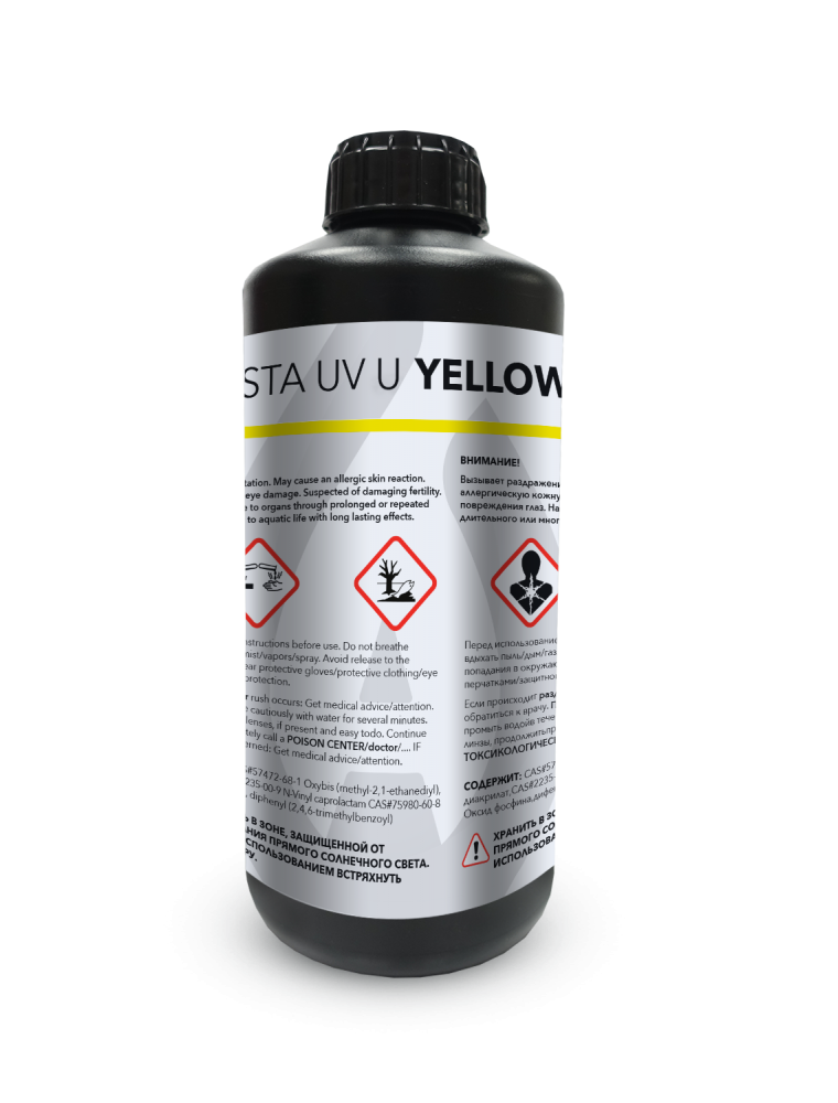 High-technology UV and LED curable inks of premium class are meant for large-format flatbed and hybrid printing systems of high (photo) resolution. Yellow color has a rich pigment of dark orange color but when printing, a pure saturated yellow color is achieved.